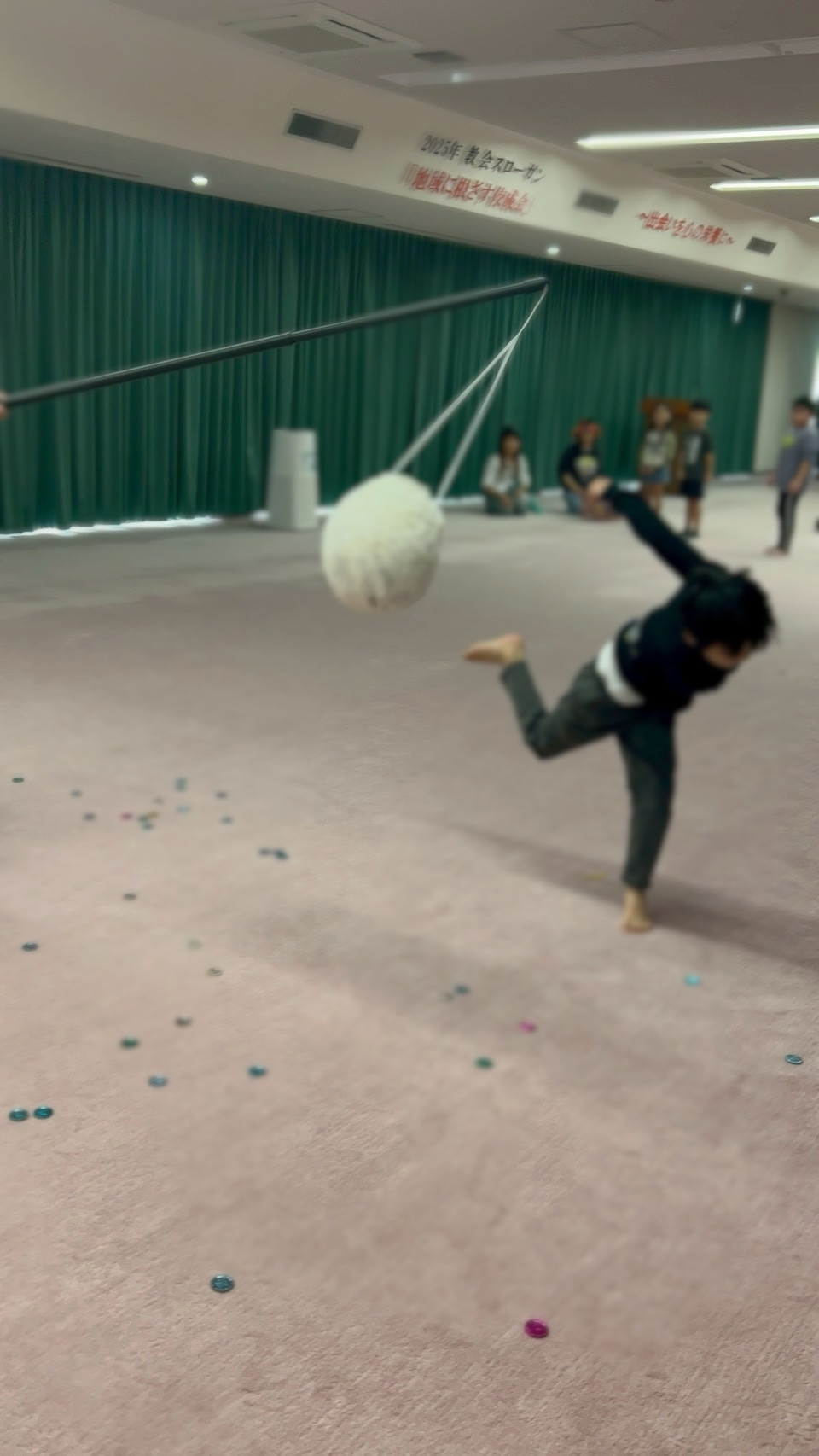 床が見えないくらいの沢山の風船の中から鈴の入った風船を探しました!
